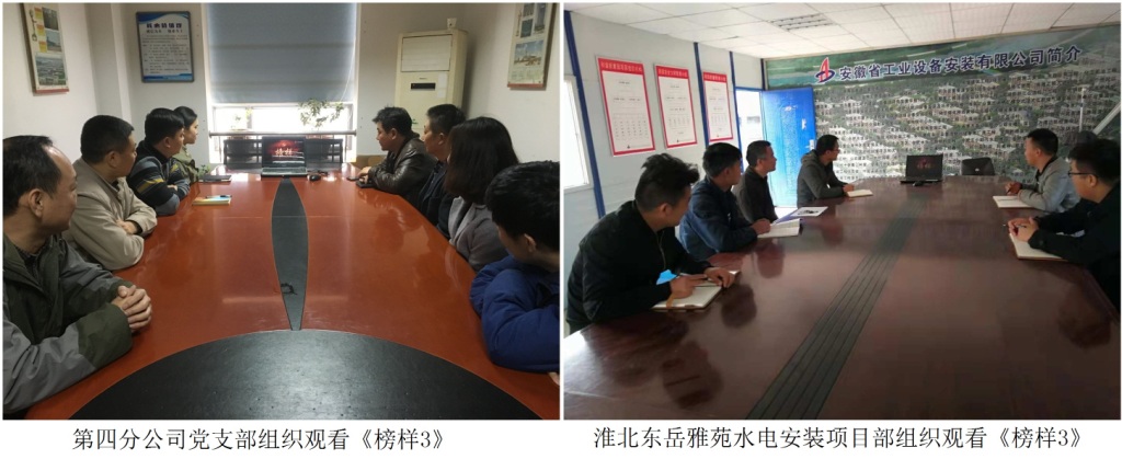 為深入學(xué)習貫徹習近平新時(shí)代中國特色社會(huì )主義思想和黨的十九大精神,深入推進(jìn)“兩學(xué)一做”學(xué)習教育常態(tài)化制度化,樹(shù)立優(yōu)秀共產(chǎn)黨員楷模,發(fā)揮先進(jìn)典型示范作用,按照《中共安徽省委組織部關(guān)于認真做好<榜樣3>專(zhuān)題節目學(xué)習宣傳工作的通知》要求,近日,安徽安裝公司組織各黨支部、項目部黨員干部職工集中觀(guān)看《榜樣3》專(zhuān)題節目。