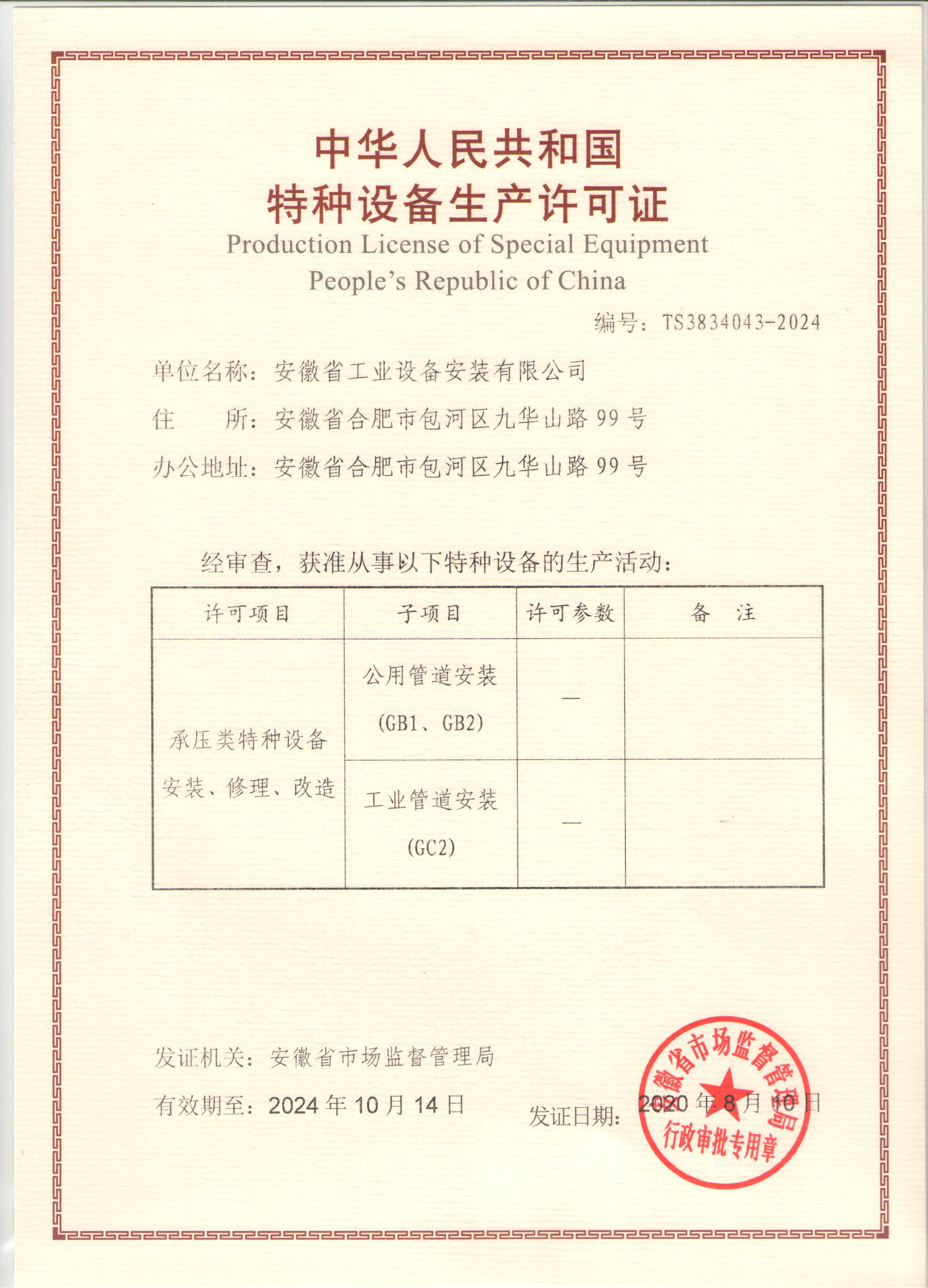 特種設備安裝改造維修許可證(壓力管道)