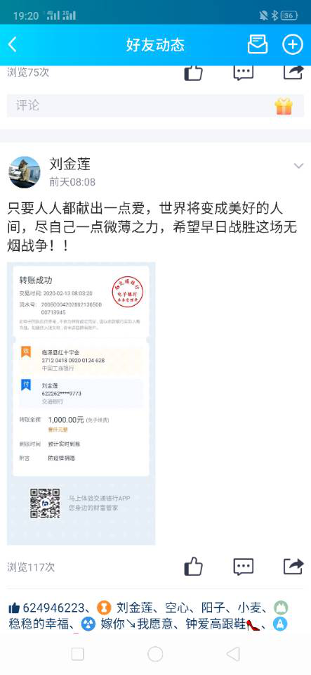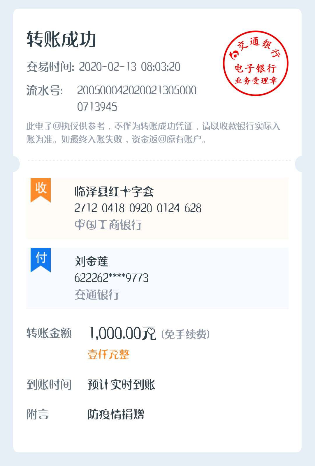 她就是寧夏辦事處職工劉金蓮同志。劉金蓮同志在工作中認真積極,是一名陽(yáng)光樂(lè )觀(guān)、任勞任怨的優(yōu)秀員工,她在平時(shí)生活工作中也總是積極主動(dòng)的幫助他人。在這次疫情爆發(fā)后,213日,劉金蓮同志主動(dòng)聯(lián)系當地甘肅省臨澤縣紅十字會(huì ),通過(guò)線(xiàn)上微信轉賬的方式,轉給紅十字會(huì )捐款人民幣1000元。接下來(lái),她又主動(dòng)聯(lián)系當地紅十字會(huì )工作人員,要求主動(dòng)擔當志愿者,但是因為客觀(guān)原因,沒(méi)有被批準。