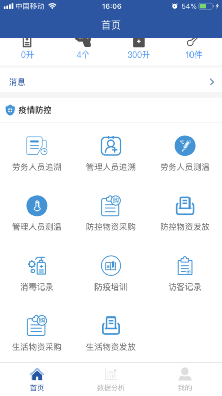 “返崗復工疫情防控系統”APP主頁(yè)面包括勞務(wù)人員追溯、勞務(wù)人員測溫、防控物資采購、消毒記錄、疫情培訓等11個(gè)專(zhuān)題版面,通過(guò)這些功能可線(xiàn)上及時(shí)填報人員返崗日期、體溫、癥狀及是否為留守人員等詳細信息,還有項目部的疫情物資采購情況、環(huán)境衛生的消殺情況等相關(guān)信息,使上線(xiàn)人員時(shí)時(shí)了解疫情防控動(dòng)態(tài),充分借助信息技術(shù)手段,全力打贏(yíng)疫情防控“戰役”。
