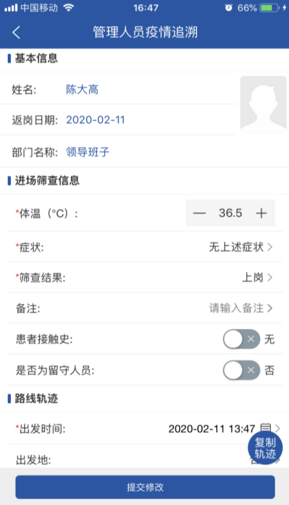 為嚴格落實(shí)復工復產(chǎn)和屬地防控責任的工作要求,有效防控疫情的輸入和擴散,阜陽(yáng)市潁東區中醫院建設ppp項目全面推行“返崗復工疫情防控系統”APP,借助這一平臺確保項目部實(shí)時(shí)、準確、有效地掌握現場(chǎng)人員的健康情況,助力疫情防控工作。