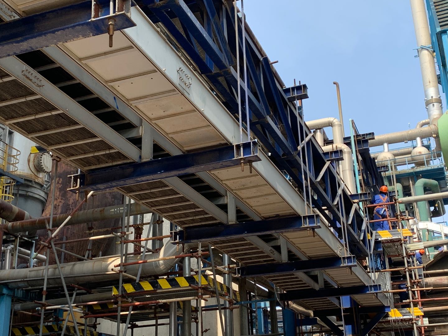“Ⅰ、Ⅱ硫磺回收裝置增設煙氣后堿洗流程項目”能使煙氣SO2排放濃度從原先的50mg/m3下降至≤10mg/m3的環(huán)保工程。但該項工程僅一個(gè)脫硫塔下段就高達33米,重達58噸,體積十分龐大,而現場(chǎng)存在作業(yè)場(chǎng)地狹小,固有障礙物多、吊重荷載大等諸多問(wèn)題,無(wú)法將設備一次性運至施工現場(chǎng)并進(jìn)行下段焊接梯子、平臺等附塔“穿衣戴帽”作業(yè)。對此,項目部多次優(yōu)化倒運方案,提前合理部署,采用額定荷載分別為220噸和90噸的汽車(chē)吊實(shí)施雙機抬吊作業(yè)和專(zhuān)為公路橋梁設計使用的炮車(chē)運輸,從而順利完成了倒運工作。同時(shí),為爭取時(shí)間,安排班組實(shí)行夜間倒班制,管理人員輪班制,為接下來(lái)的脫硫塔“穿衣戴帽”和上下段空中組對焊接作業(yè)爭取了寶貴時(shí)間。