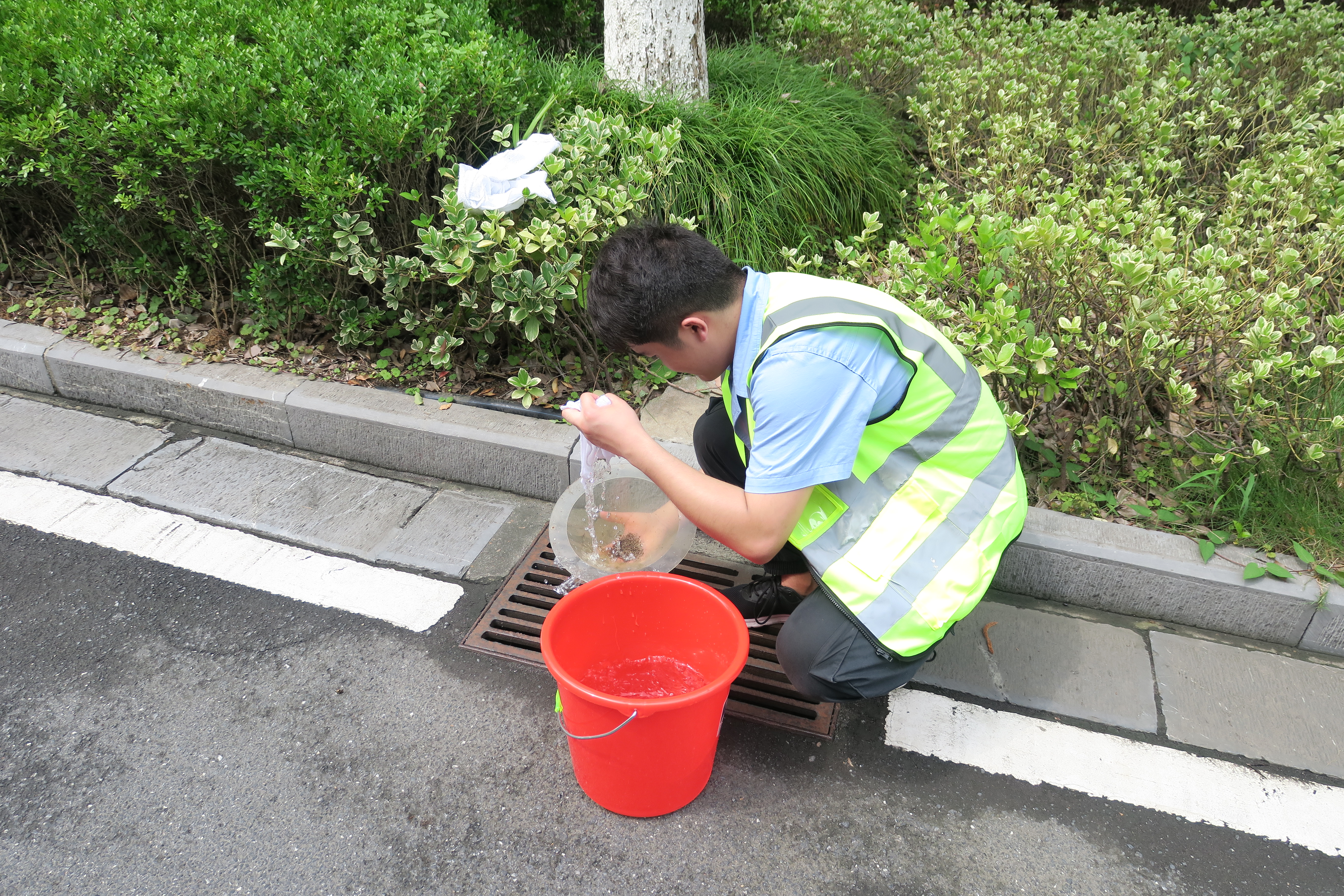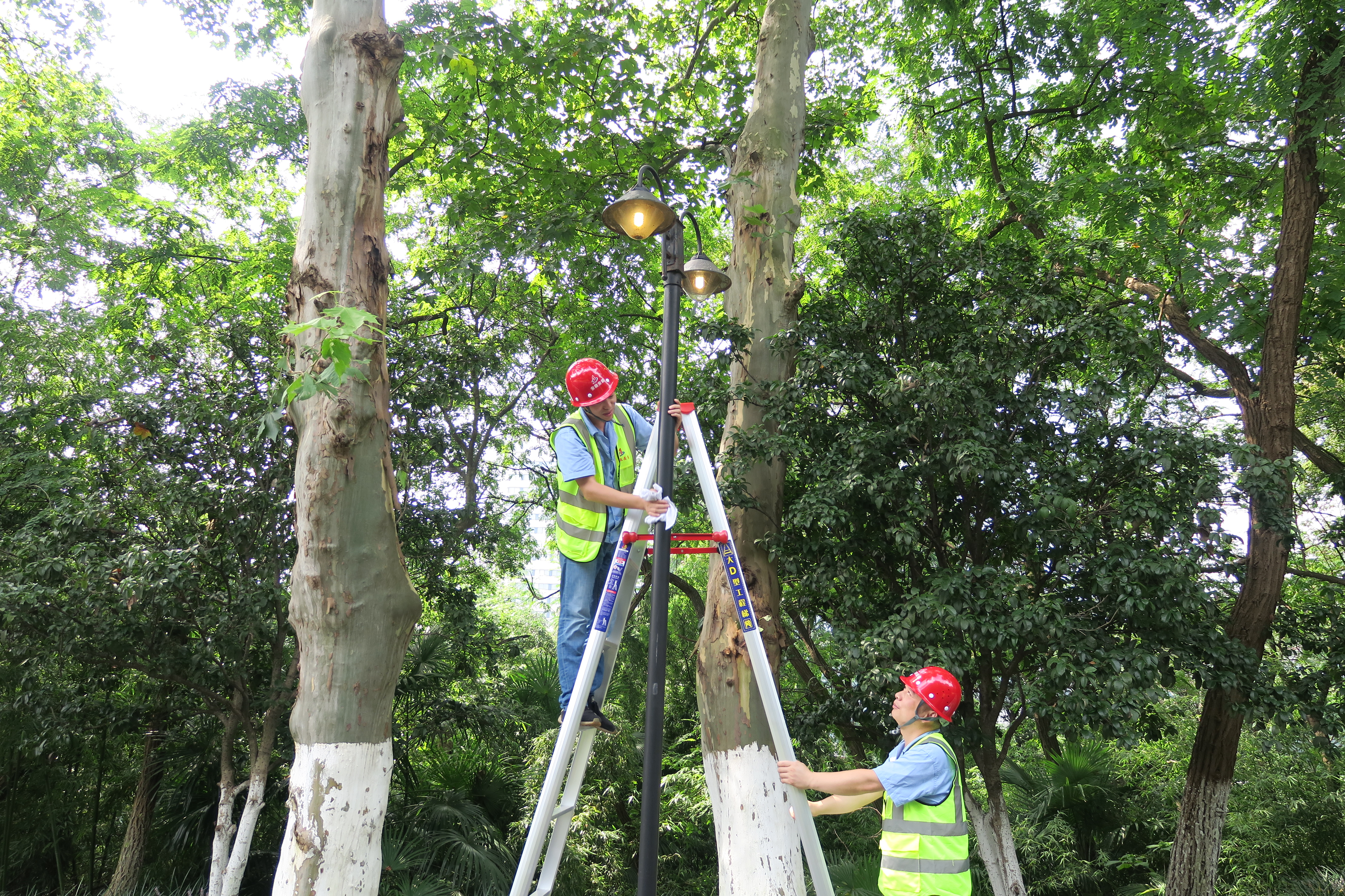 到達項目現場(chǎng)后,大家迅速分組,每組都由一名有施工經(jīng)驗的老員工帶領(lǐng)。在項目部負責人的統一指揮下,大家帶好安全護具和工作用具,進(jìn)入施工現場(chǎng)開(kāi)始了緊張的勞動(dòng)。此時(shí)室外氣溫達到38攝氏度,但大家絲毫不懈怠、不畏懼,頭頂烈日為路燈刷油漆、洗燈罩、換燈泡,竭心盡力的完成各項工作。