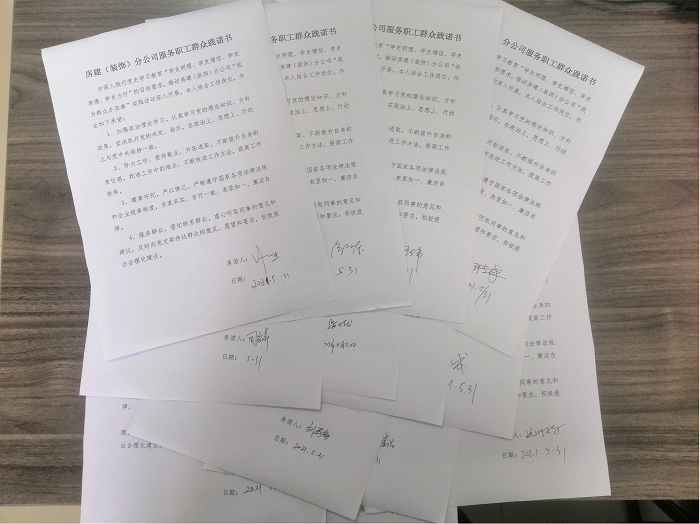 會(huì )議最后,所有與會(huì )人員簽訂了《房建(裝飾)分公司服務(wù)職工群眾踐諾書(shū)》,布置下發(fā)了《黨史、新中國史、改革開(kāi)放史、社會(huì )主義發(fā)展史知識測試題匯編》。