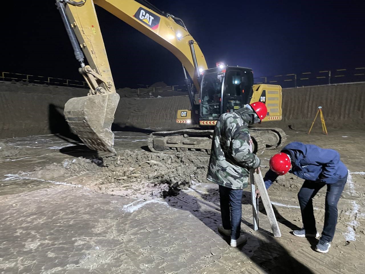 為滿(mǎn)足西動(dòng)力中心承臺澆筑要求,施工現場(chǎng)燈火通明,項目經(jīng)理徐明東帶領(lǐng)施工員正在認真進(jìn)行西動(dòng)力中心承臺基礎測量復核工作。