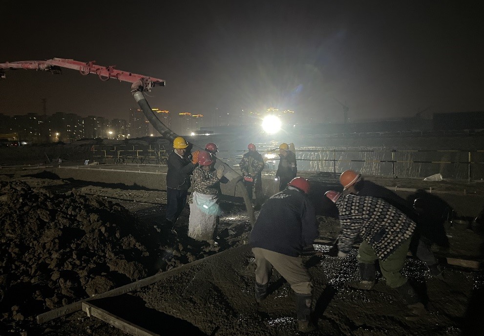 工人師傅們晚上加班加點(diǎn)進(jìn)行西動(dòng)力中心基礎墊層澆筑