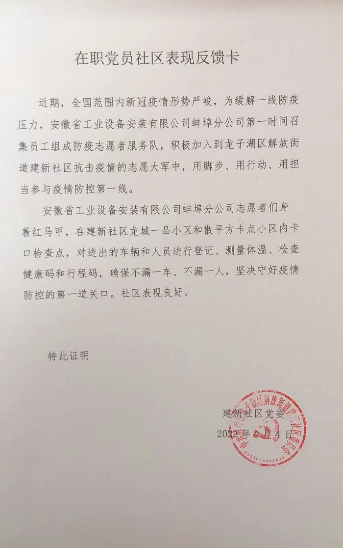 通過(guò)本次活動(dòng),志愿者們用實(shí)際行動(dòng)踐行了初心和使命,展現了安徽安裝志愿者飽滿(mǎn)的精神風(fēng)貌。建新社區黨委表達了對于安徽安裝公司的真誠感謝,期間社區及時(shí)通過(guò)微信公眾號對安徽安裝積極擔當社會(huì )責任予以報道,有效擴大了企業(yè)影響力,樹(shù)立了良好企業(yè)形象。
