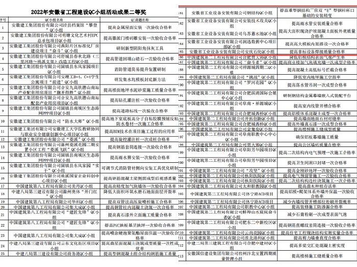 近日,從安徽省建設行業(yè)質(zhì)量與安全協(xié)會(huì )傳來(lái)喜訊,協(xié)會(huì )發(fā)布的《關(guān)于2022年安徽省工程質(zhì)量管理小組及質(zhì)量信得過(guò)班組建設活動(dòng)成果的通知》文件中,安徽安裝公司共獲得11項安徽省工程建設QC小組活動(dòng)成果獎項。