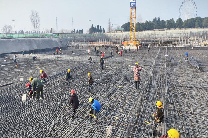 圖為施工現場(chǎng)水解酸化池筏板鋼筋綁扎