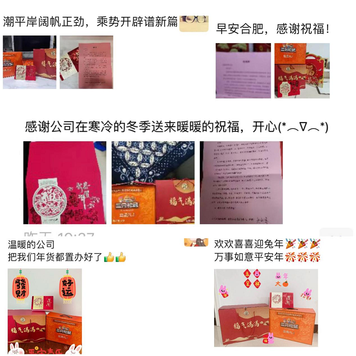 為了表達對分公司全體員工一年來(lái)辛勤工作的感謝之情和最誠摯的新春?jiǎn)?wèn)候,分公司從細節著(zhù)手,從點(diǎn)滴做起,通過(guò)新春送溫暖活動(dòng),傳遞對廣大員工的關(guān)心和慰問(wèn)。春節前,分公司特別為大家送去了飽含深情的《感謝信》和新年大禮包,將美好的祝福送到了每位員工的心坎里。同時(shí)還為新入職員工送去了《歡迎辭》,表達了分公司求賢若渴的殷殷期待,并希望他們能立足崗位,踏實(shí)工作,為企業(yè)高質(zhì)量發(fā)展奉獻青春和力量,書(shū)寫(xiě)屬于自己的絢麗華章。