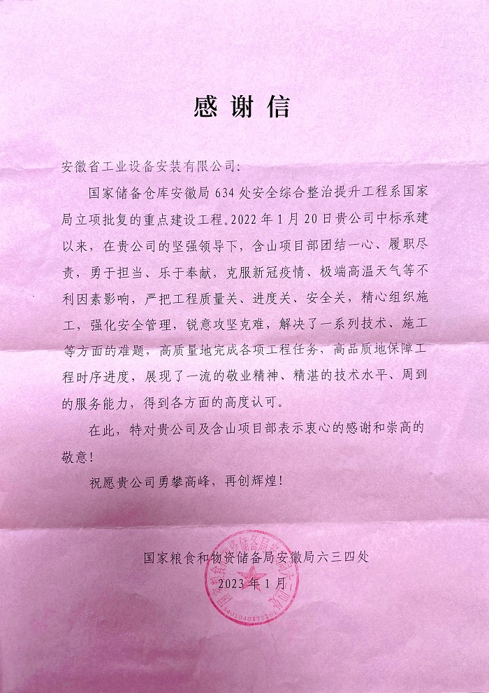 近日,安徽安裝合肥分公司收到業(yè)主方國家糧食和物資儲備局安徽局六三四處的感謝信,對公司“國家儲備倉庫安徽局634處安全綜合整治提升工程”克服諸多困難,精心組織,科學(xué)管理,高質(zhì)量完成工程施工任務(wù)的突出成績(jì)給予高度贊揚,并表達了由衷感謝。