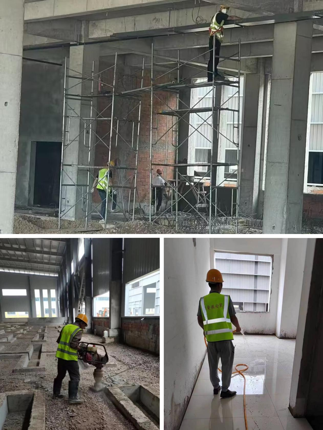 肥西安信立士項目現場(chǎng)正在進(jìn)行地基夯實(shí)、橋架安裝、瓷磚灑水養護