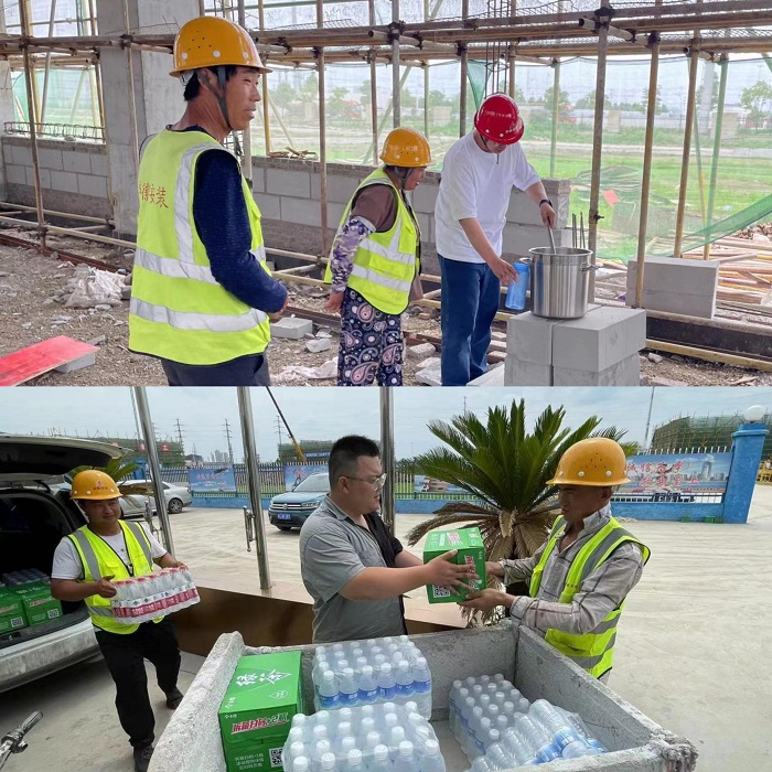 為應對高溫天氣安全施工,項目部提前制定防暑降溫工作方案,管理人員在現場(chǎng)設置納涼棚為工人提供休息場(chǎng)地,針對高溫天氣,采取干兩頭避中間,利用夜晚加班等方式全力推進(jìn)施工進(jìn)度。同時(shí)項目后勤保障人員在高溫時(shí)段提供礦泉水、綠茶等清涼解暑飲品,并持續每天熬制綠豆湯分發(fā)至各班組,為每位員工帶來(lái)絲絲清涼。項目安全科備足人丹、藿香正氣液、十滴水、清涼油、風(fēng)油精等防暑降溫用品,做好高溫天氣施工保障,確保施工安全、高效、有序推進(jìn)。