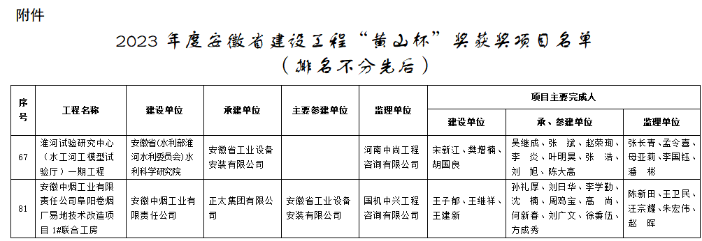 7月25日,安徽省住房和城鄉建設廳 、安徽省交通運輸廳、安徽省水利廳聯(lián)合發(fā)布《關(guān)于公布2023年度安徽省建設工程“黃山杯”獎獲獎項目名單的通知》,由建工安裝集團蚌埠分公司承建的“淮河試驗研究中心(水工河工模型試驗廳)一期工程”和參建的“安徽中煙工業(yè)有限責任公司阜陽(yáng)卷煙廠(chǎng)易地技術(shù)改造項目1#聯(lián)合工房”等2個(gè)項目均獲2023年度安徽省建筑行業(yè)建設工程質(zhì)量最高榮譽(yù)獎“黃山杯”。其中“淮河試驗研究中心(水工河工模型試驗廳)一期工程”是建工安裝公司首次作為承建單位獲此殊榮;“安徽中煙工業(yè)有限責任公司阜陽(yáng)卷煙廠(chǎng)易地技術(shù)改造項目1#聯(lián)合工房”項目同時(shí)正在申報國家級安裝行業(yè)最高獎項中國安裝工程優(yōu)質(zhì)獎(安裝之星),5月份預檢已通過(guò),等待9月復檢。兩個(gè)項目作為承建和參建單位一舉捧得2樽“黃山杯”,也是蚌埠分公司歷史首次,同時(shí)也是蚌埠分公司近年來(lái)捧得的第5、第6樽“黃山杯”獎項。