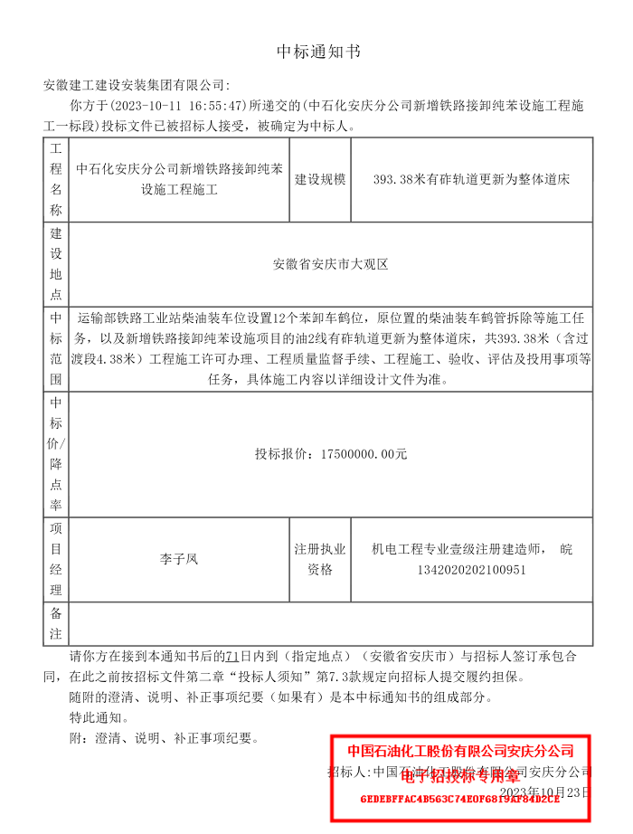 喜報!建工安裝安慶分公司中標中石化安慶分公司新增鐵路接卸純苯設施工程