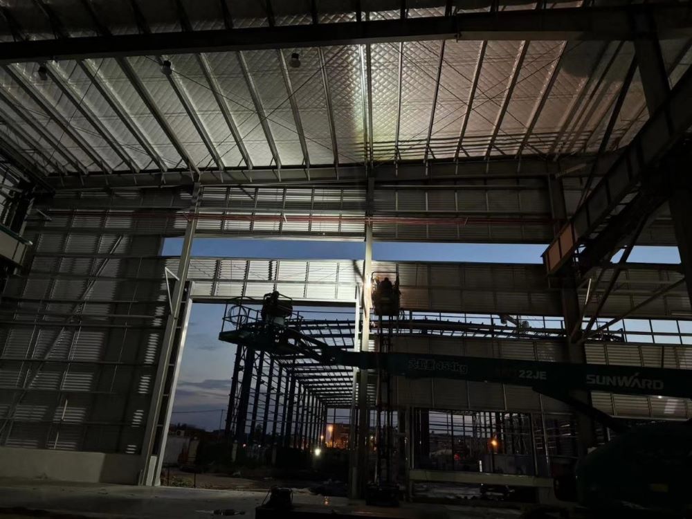 建工安裝合肥分公司施工內容涉及2#重鋼車(chē)間主次構安裝、圍護系統、門(mén)窗、防火涂料、通風(fēng)氣樓和機電安裝工程(裝飾裝修、工藝管線(xiàn)、消防、給排水、電氣、通風(fēng)空調等)。為保質(zhì)保量完成施工任務(wù),分公司派駐分管領(lǐng)導現場(chǎng)駐點(diǎn),項目管理團隊日夜跟進(jìn),施工人數達到100多人,曲臂車(chē)、登高車(chē)等各種現場(chǎng)施工機械達60余輛。本項目留給機電安裝工期緊任務(wù)重,項目全體人員日夜奮戰,最終刷新15日大面完工耀眼戰績(jì),為基地順利投產(chǎn)奠定堅實(shí)基礎。