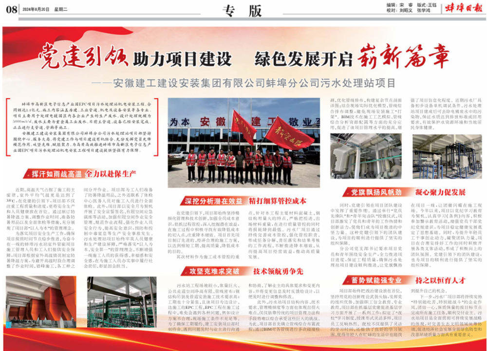 媒體專(zhuān)版報道了建工安裝蚌埠分公司高新區電子信息產(chǎn)業(yè)園EPC項目污水處理站機電安裝工程項目的基本概況,以及該項目抓黨建、保生產(chǎn)、降成本、強技術(shù)、育人才等方面的成功經(jīng)驗和做法。