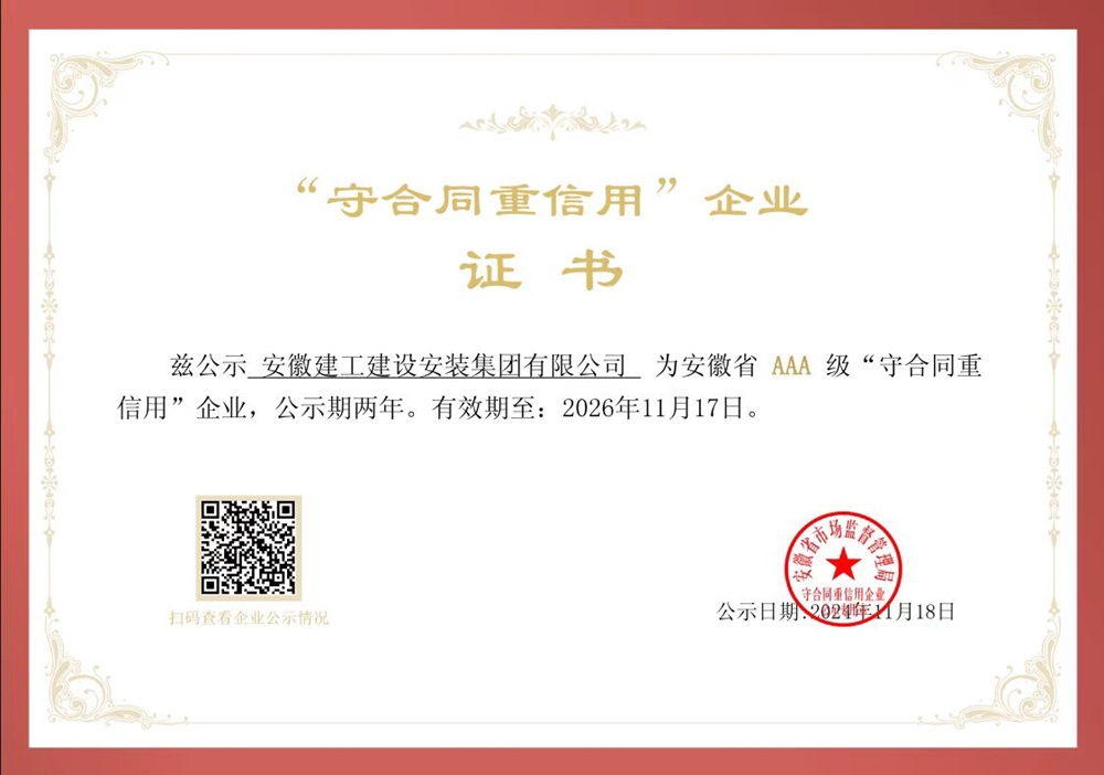近日,安徽省市場(chǎng)監督管理局傳來(lái)喜訊,安徽建工建設安裝集團有限公司被評為安徽省AAA級“守合同重信用”企業(yè)。